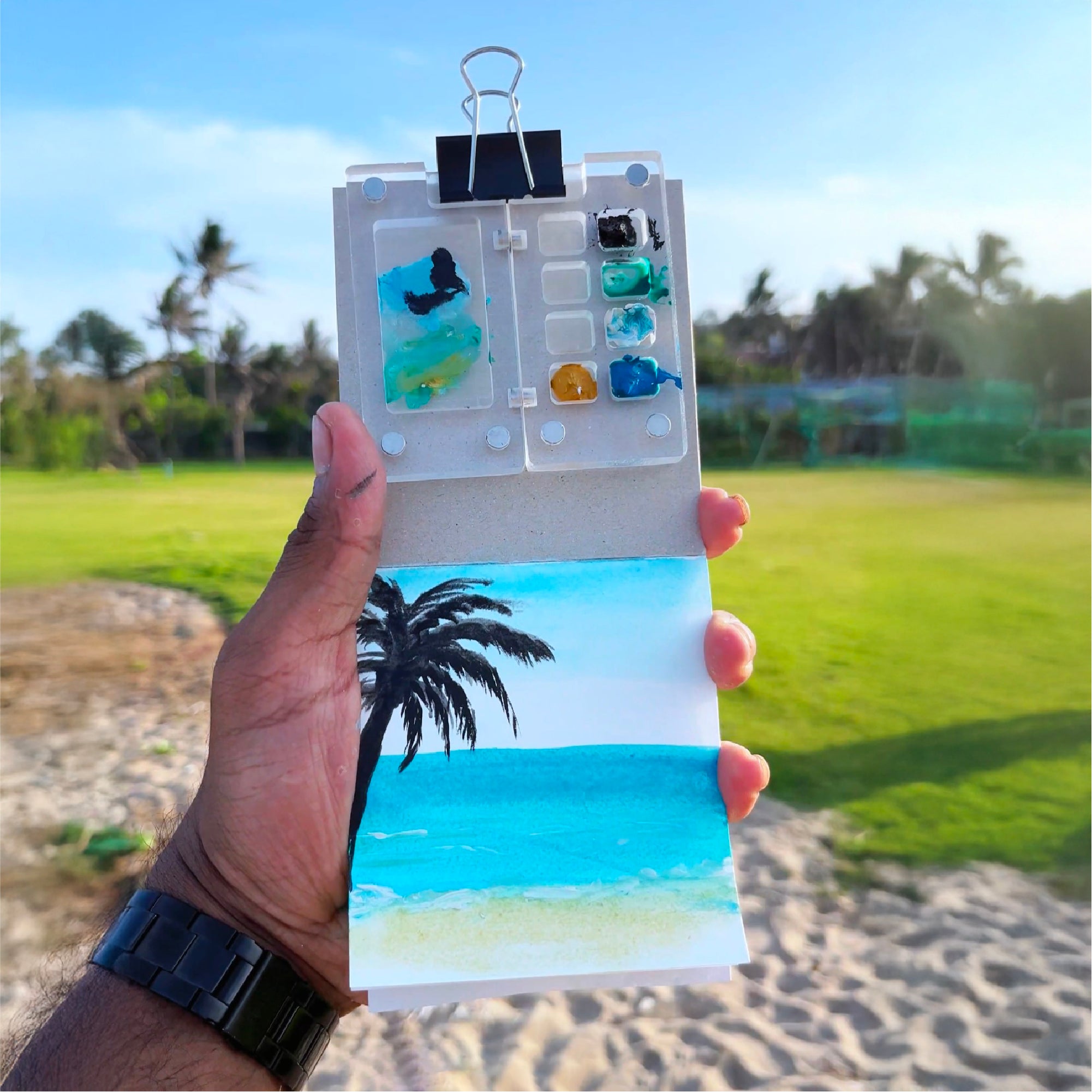 Open the kit , it comes with palette , water brush, binding clip and sketch book. Strong magnets allows to hold the palette together.